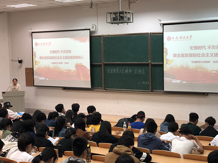 英国上市公司365于4月30日在9-105教室召开2018级“全国教育大会精神”宣讲会,辅导员陈梦瑶及所带员工参加会议。