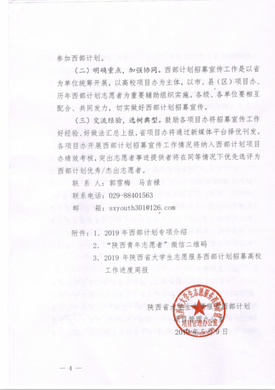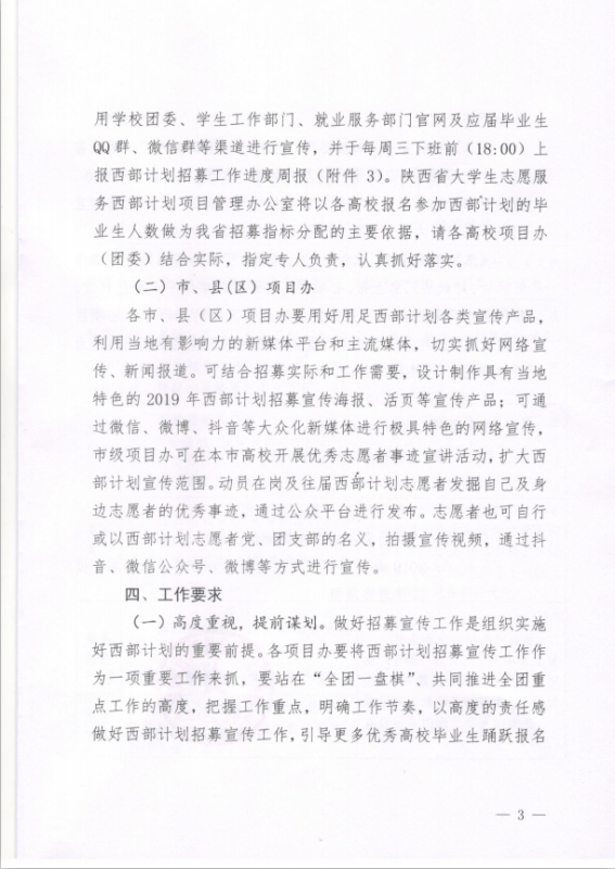 陕西省西部计划项目办公室关于做好2019年陕西省老员工志愿服务西部计划志愿者招募宣传工作的通知 2019-04-14 1411 办公室 [$Content_Label[0]$] 撰写:马彬 审核:齐垚 编辑:胡靖怡