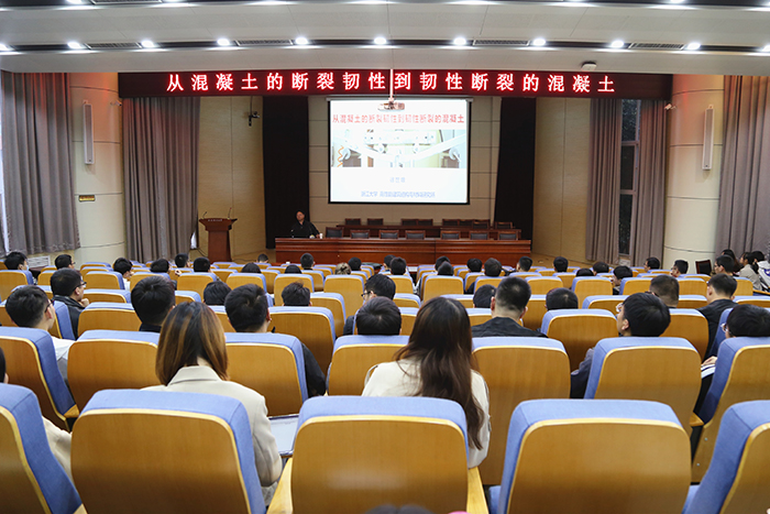 徐世烺教授凭借自己多年工作积累的经验和丰富的阅历,主要从混凝土结构裂缝安全评价双K断裂理论、高韧性混凝土设计原理与制备技术及结构性能等方面进行讲解,分析了混凝土小变形与荷载作用大变形基本矛盾在结构服役过程中长期未解及混凝土开裂对基础设施百年安全服役极为不利等方面的问题。与同学们分享了水工结构与大坝安全性分析的研究工作。徐世烺教授的研究工作完美地实现了从研究混凝土的断裂韧性到发明了韧性断裂的混凝土。