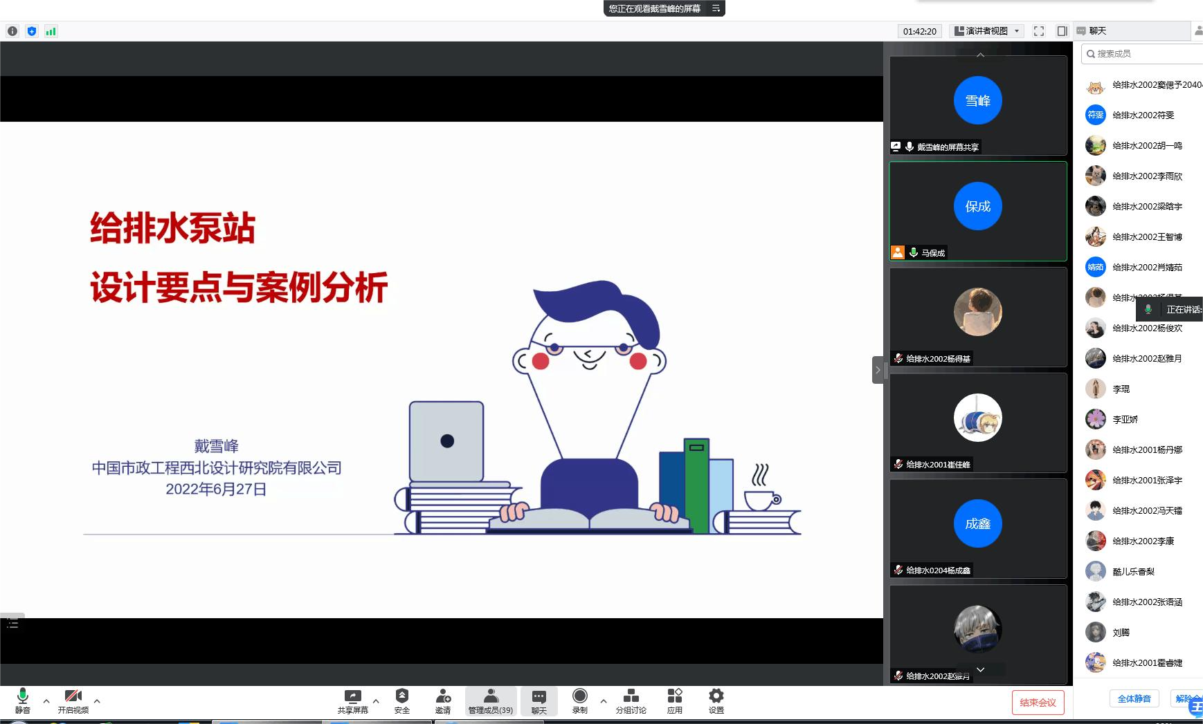 6月27日晚,给排水科学与工程专业邀请中国市政工程西北设计研究院有限公司高级工程师戴雪峰(公司2010届毕业生,国家注册公用设备工程师)为给排水2020级50名员工作线上学术讲座,主题为《给排水泵站设计要点与案例分析》。报告会由给排水科学与工程系主任李亚娇主持。